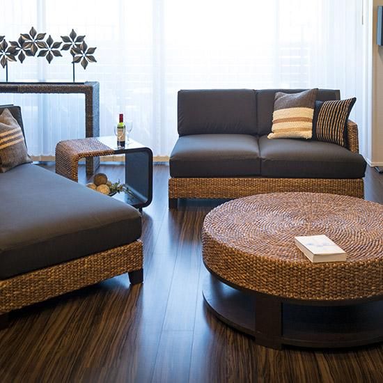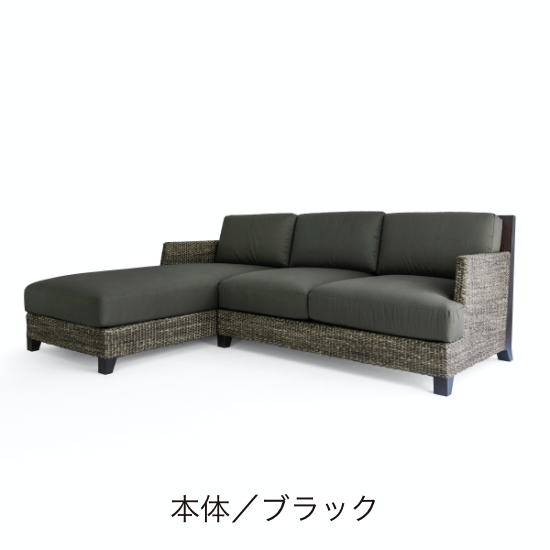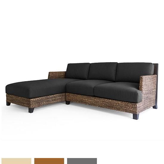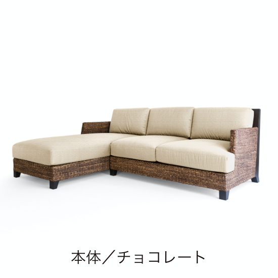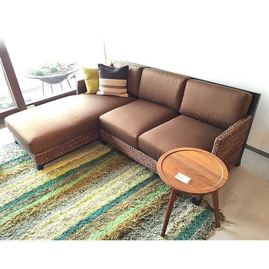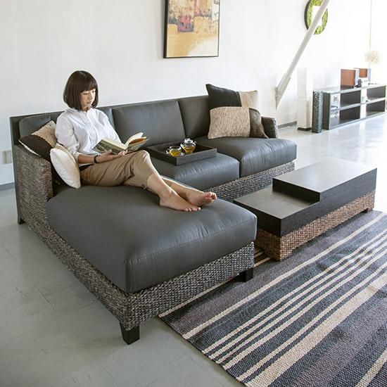 人気のL型コーナーソファセットです。ウォーターヒヤシンスのナチュラルな質感と直線的でモダンなデザインがバランスよくまとめられたこのモデルはどんなお部屋にもコーディネイトしていただけます。向かって左側が足を伸ばせるカウチとなります。