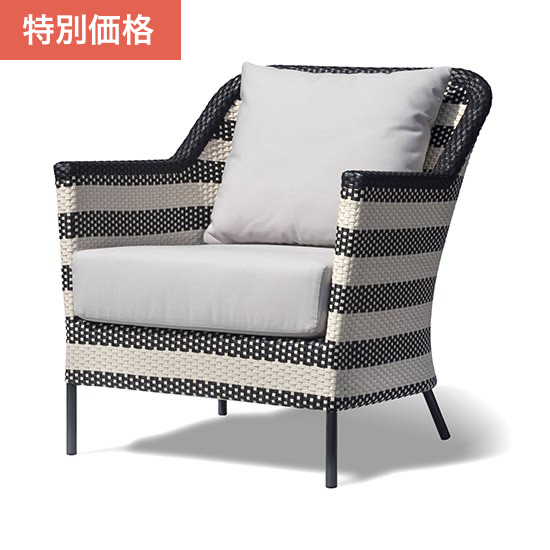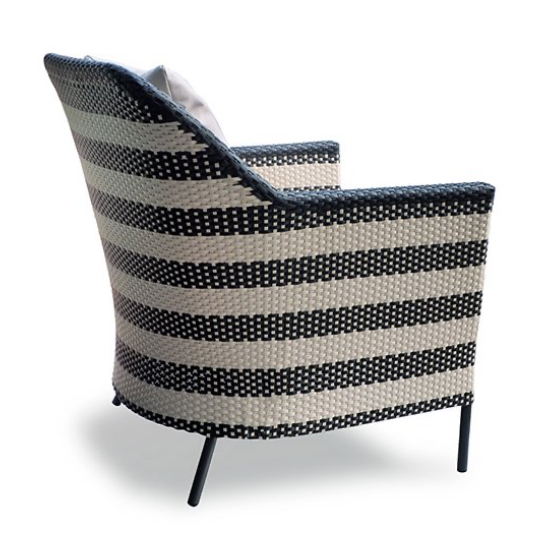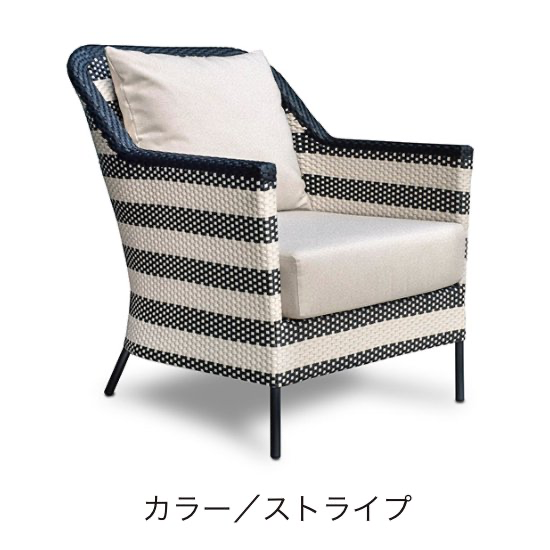 白と黒のストライプ柄に編み込んだポリエチレン7mmに、ウォータプルーフ生地を組み合わせたチェアです。美しいフォルムとゆったりとした座り心地のこのアームチェアは多くのリゾートホテルの屋外でもご利用頂いております。